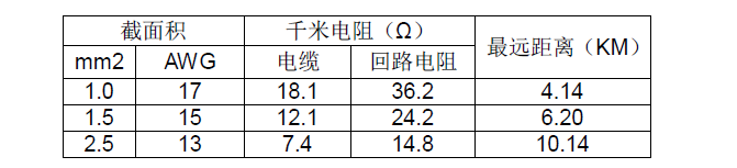 根據使用屏蔽線纜的技術參數可確定檢測儀的最遠傳輸距離,見下表: